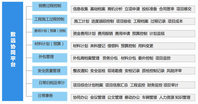 对材料采购、合同、付款,验收整个环节进行有效控制,有效减少成本支出,增加项目利润。协同工作日常协同办公职能审批管理单项业务的查询、统计报表过程管控